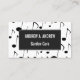 This business card design features a pattern of various sized music notes. It might be appreciated by a musician, a composer, a singer, or somebody else who really likes music. The front also features a dark-coloured rectangular shaped area containing a name and a profession/role/title/position that can both be personalised. The back features a simple design including a name, a profession/role/title/position, and contact details that can be personalised. This business card design could be used by a professional, or perhaps by a small business owner. [~Z0000061]