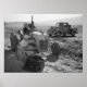 Manzanar Relocation Centre mechanic Henry Hanawa working on an old tractor while driver Benji Iguchi looks on. Nice old pickup truck in the background. WW2 photo taken in 1943 by photographer Ansel Adams.