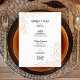 Customise the natural Maple Leaf Edge Fall Wedding Menu with the details of the meal that you will serve at your September, October or November woodland bridal shower luncheon, post wedding brunch or marriage reception by adding the salad or first course, entree or second course and dessert or third course. Personalise it with the names of the bride and groom, venue location and event date. This woodsy custom autumn wedding menu features brown tone maple leaves adorning the corners with a white background.