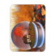 Inside a "snow globe" is an autumn landscape with a cottage overshadowed by maple and cherry trees. The surrounding field is filled with tall green and golden grass. Roses and ivy climb the wall of the little house. The maple tree is in brilliant fall colour, and instead of snow there are maples leaves in shades of red, orange, and yellow swirling around in the globe and blanketing the grass.