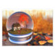 Inside a "snow globe" is an autumn landscape with a cottage overshadowed by maple and cherry trees. The surrounding field is filled with tall green and golden grass. Roses and ivy climb the wall of the little house. The maple tree is in brilliant fall colour, and instead of snow there are maples leaves in shades of red, orange, and yellow swirling around in the globe and blanketing the grass.