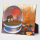 Inside a "snow globe" is an autumn landscape with a cottage overshadowed by maple and cherry trees. The surrounding field is filled with tall green and golden grass. Roses and ivy climb the wall of the little house. The maple tree is in brilliant fall colour, and instead of snow there are maples leaves in shades of red, orange, and yellow swirling around in the globe and blanketing the grass.