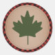 A sticker featuring an illustration of a green maple leaf over a card stock inspired background with a red and black plaid border. Look for matching invitations at Jill's Paperie.
