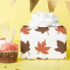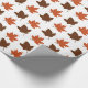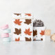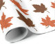 Brown and burnt orange maple leaves on autumn gift wrap.