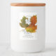 Customise with your business name, address, maple syrup grade and volume. Form fields contain lists of new maple syrup grade names and popular volumes of maple syrup in ounces and milliiliters, so you don't need to calculate anything. Optional vertical text on the side lists serving suggestions for maple syrup. Design includes colourful red, yellow and green sugar maple leaf photo and a smaller black and white sugar maple leaf illustration.