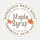 Maple Syrup Label with a Back Woods feel. The words "Maple Syrup" appears to be poured out in a 3D maple-coloured font.  Business name and location in embossed-looking text. Vintage chain link border in gold. Editable form field for Grade of Maple Syrup and net weight. Yellow and orange autumn sugar maple leaves tinged with green.