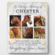 Personalised horse photo plaque featuring 6 precious pictures of your beloved pet animal, a modern marble background, gold horseshoes & glitter, the text "in loving memory of", your horses name, birth/death dates, and the sympathy quote "your presence we miss, your memory we treasure, loving you always, forgetting you never".