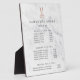 Elegant plaque with easel displays your salon services or price list in charcoal gray lettering on a white marble background adorned with a scissors logo in faux rose gold foil. Includes three customizable headings and body text fields. To adjust layout, enter your text and then use the Customize function to change positioning and font sizes.