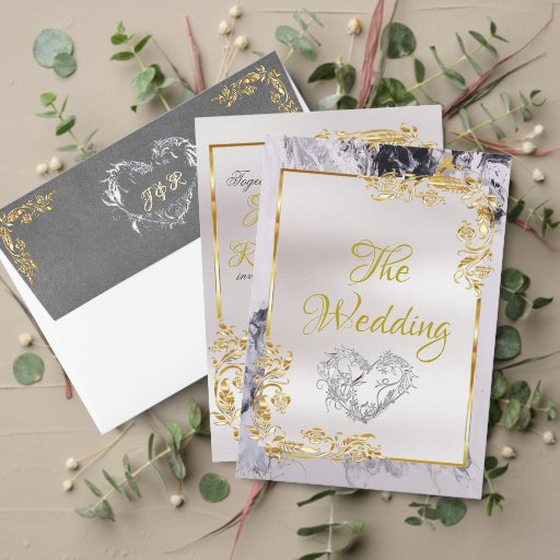 Marble & White, Gold Frame, Gold Heart All In One Invitation
