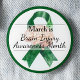 Behind the text, a green awareness ribbon stands as a symbol of support and advocacy. Overlaying the ribbon, a detailed illustration of a human brain reinforces the focus on brain health, recovery, and awareness. The entire design is framed by a bold green border, giving the button a polished and eye-catching finish.