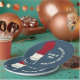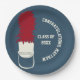 Create personalised party supplies for graduation parties and other special events. These custom paper plates are perfect for marching band members and feature a simple illustration of a marching band hat with feathers on the top in cream or ivory and dark red, set against a navy blue background. Your text appears in bold cream coloured lettering.