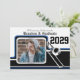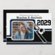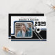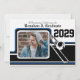 Varsity Stripe with Trombone Graduation party invitation with photo accented in blue. Customise for any college, university or high school graduation. Change text to fit your needs. Add information to back of invitation too.