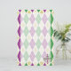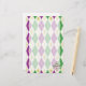 Bright purple and green diamonds overlaid with gold-toned diamond outlines and fleur de lis bring to mind the revelry and celebrations associated with a New Orleans Mardi Gras, while a cream base adds a touch of refinement to this argyle pattern. A patterned fleur de lis sits in the bottom corner of the stationery to create a cute added touch.