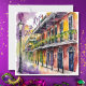 Festive New Orleans Mardi Gras themed party invitation in green gold and purple, the traditional colours of Fat Tuesday carnival. Perfect invite for NOLA themed parties. Wavy faux glitter design.