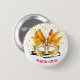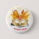 This square button pin is shown with a festive Mardi Gras mask print design.