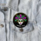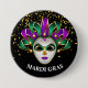 This round button pin is shown with a festive Mardi Gras mask print design.