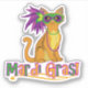 This cute cat is ready to celebrate Mardi Gras! She is wearing a some green, purple, and yellow beads as well as a colourful feathered mask.
