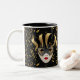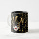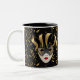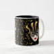 This ceramic coffee mug is shown in a festive Mardi Gras mask print.