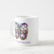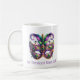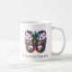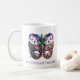 This ceramic coffee mug is shown with Mardi Gras images, Text of "Let the good times roll' is beneath the prints.