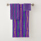 This towel set has a geometric Mardi Gras design of sort of flat-ended ovals repeating across the design in gold and green on a field of purple.