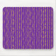 This mouse pad has a geometric Mardi Gras design of sort of flat-ended ovals repeating across the design in gold and green on a field of purple.