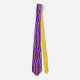 This necktie has a geometric Mardi Gras design of sort of flat-ended ovals repeating across the design in gold and green on a field of purple.
