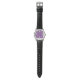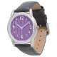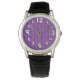 This men's watch has a geometric Mardi Gras design of sort of flat-ended ovals repeating across the design in gold and green on a field of purple.