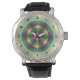 If you love Mardi Gras, this design will be great for you. It features shades of green, gold, and purple arranged in rings from dark to light that gives the circle a 3D look. This watch is available in a variety of sizes and styles, including both kids' and adult sizes.
