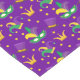 Mardi Gras table runner with colourful feather mask, crown, purple, green, golden clown hat and stars.