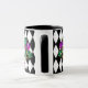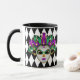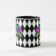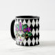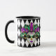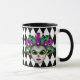 This combo black and white mug has an image of a festive Mardi Gras mask over a black and white diamond pattern print.
