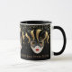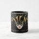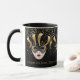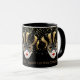 This combo black and white mug has an image of a Mardi Gras mask over petite golden-colour stars on black background. Text of "Laissez Les Bons Temps Rouler" [let the good times roll in Cajun-French] is beneath the three masks on the mug. Customise this item or buy as designed. Colours: Black, Golden-tone, White, Grey. Image printed on.