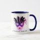 This combo deep Blue and white mug has an image of a Mardi Gras masks over petite golden-colour stars on a white background. Text of "Let the good times roll' is beneath the mask on Each side of the mug. Customise this item or buy as designed. Colours: deep blue handle and interior, white background, golden stars and a colourful print of purples, red and black masks.