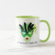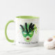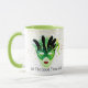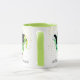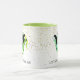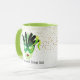 This combo green and white mug has an image of a Mardi Gras masks over petite golden-colour stars on a white background. Text of "Let the good times roll' is beneath the mask on Each side of the mug. Customise this item or buy as designed. Colours: green handle and interior, white background, golden stars and a colourful masks of green colours.