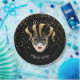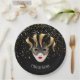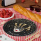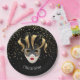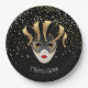 Paper plates shown with a festive Mardi Gras Mask print design in Black.