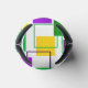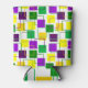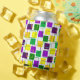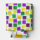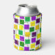 This can cooler has a geometric design of squares in purple, yellow, and green scattered about with their outlines.