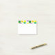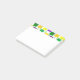 This Post-It notepad has a geometric design of squares in purple, yellow, and green scattered about with their outlines.