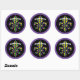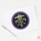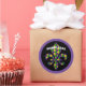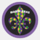 This large size round sticker is shown in a festive Mardi Gras celebration Fleur De Li print design.