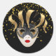 This small size round sticker is shown in a festive Mardi Gras celebration mask print design.