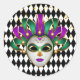 This small size round sticker is shown in a festive Mardi Gras celebration mask print design.