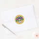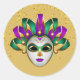 This small size round sticker is shown in a festive Mardi Gras celebration mask print design.