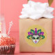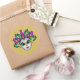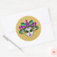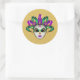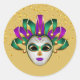 This large size round sticker is shown in a festive Mardi Gras celebration mask print design.