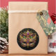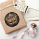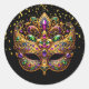 This large size round sticker is shown in a Mardi Gras celebration mask print design.