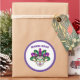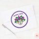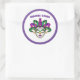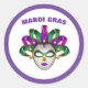 This large size round sticker is shown in a festive Mardi Gras mask celebration print design.