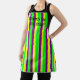 This apron has a simple Mardi Gras design of vertical stripes in yellow, green, and purple.