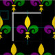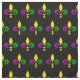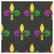 Fabric with seamless pattern with fleur-de-lys (lilly flowers) in the colours of New Orleans Mardi Gras; purple, golden and green design on black background