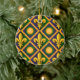 A ceramic ornament with a seamless pattern with fleur-de-lis (lily flowers) in the colors of New Orleans Mardi Gras; purple, golden, and green design