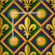 Fabric with a seamless pattern with fleur-de-lis (lily flowers) in the colours of New Orleans Mardi Gras; purple, golden, and green design