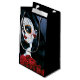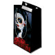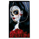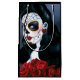 Portrait of a woman wearing a sugar skull day of the dead make-up with red roses in a backdrop of blue grey