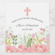 Soft pink and green wild flowers accent the bottom of the label. Embellished with a pink and white cross.