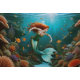 “Marielle” – Beautiful Dancing Mermaid. Aquatic Ballet: In this mesmerising image, a stunning mermaid with flowing red hair dances gracefully on the seabed, her green and blue fishtail sparkling in the water. Surrounded by an underwater garden of fish and coral, she appears to be moving to the rhythm of gentle aquatic tunes. The scene, filled with subtle multi-coloured hues, captures the serene, flowing beauty of this stylised Pre-Raphaelite art. Have you ever seen a mermaid dance so elegantly in the deep blue sea?
